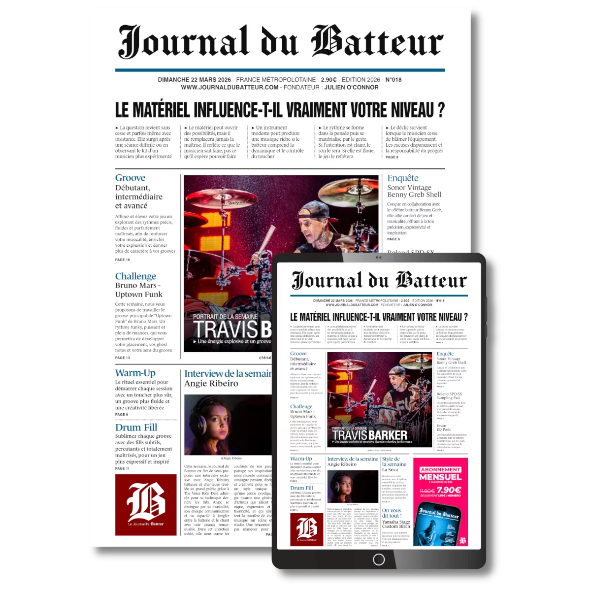 Abonnez-vous au Journal du Batteur pour seulement 7,90€ par mois au lieu de 11,60€ et recevez 4 numéros chaque mois. Chaque numéro vous offre du contenu exclusif conçu pour vous faire progresser régulièrement et structurer votre pratique. Vous découvrirez des exercices et des grooves pour enrichir votre jeu et explorer de nouvelles techniques. Chaque semaine, profitez d’un rendez-vous inspirant pour rester motivé et nourrir votre passion pour la batterie. Cette offre vous accompagne pas à pas dans votre évolution musicale et transforme votre façon de jouer.